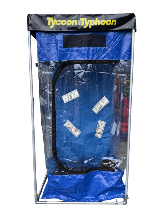 A clear, enclosed booth with a built-in fan that whips cash, coupons, or prize tickets into a whirlwind while a timer counts down. Players step inside and try to grab as many as they can before time runs out. Compact, sturdy, and attention-grabbing; suitable for teens and adults indoors or outdoors. Requires a standard electrical outlet and a flat setup area.